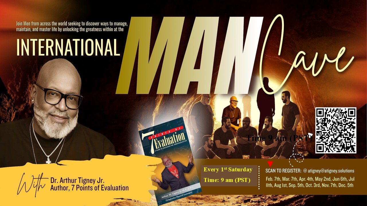 Join Dr. Arthur Tigney, Licensed therapist, Coach, Pastor, and Author, as he explores with men 7 points of Evaluations. Men from all over the world will be joining on this live zoom, expecting to grow in manhood, leadership, and spiritual maturity!